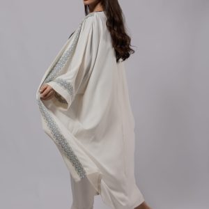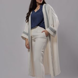 Élevez votre garde-robe avec ce magnifique kimono blanc cassé, une pièce qui incarne la pureté et l’élégance. Il se distingue par ses délicates bordures brodées d’un bleu saphir raffiné, ajoutant une touche artisanale à sa coupe fluide et aérienne. Idéal pour superposer sur une tenue chic ou décontractée pour un rendu instantanément sophistiqué.